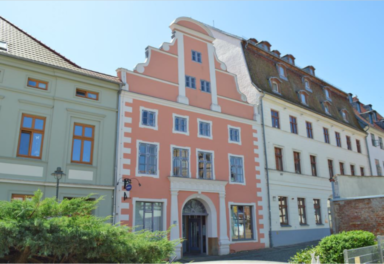 Das ca 1700 gebaute Haus gehört zu den ältesten Häusern Wolgasts und ist, vom Hafen kommend, eines der ersten Geschäftshäuser in der Wolgaster Altstadt und steht direkt neben dem Rathaus.